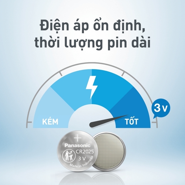 Pin Panasonic CR2025 cung cấp điện áp 3V ổn định, hỗ trợ thiết bị hoạt động mượt mà, đặc biệt là các thiết bị cần nguồn pin nhỏ nhưng yêu cầu độ ổn định cao.