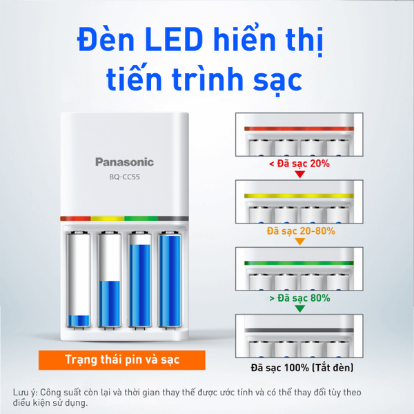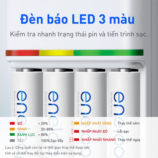 Mỗi khe pin có đèn LED riêng báo trạng thái (đang sạc / đầy / lỗi).